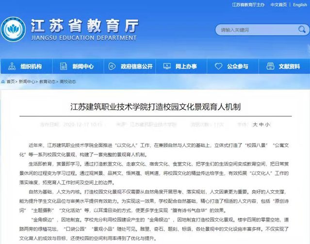 近年来,江苏建筑职业技术学院全面推进“以文化人”工作,在兼顾自然与人文的基础上,立体式打造了“校园八景”“公寓文化”等一系列校园文化景观,构建了一套完整的景观育人机制。