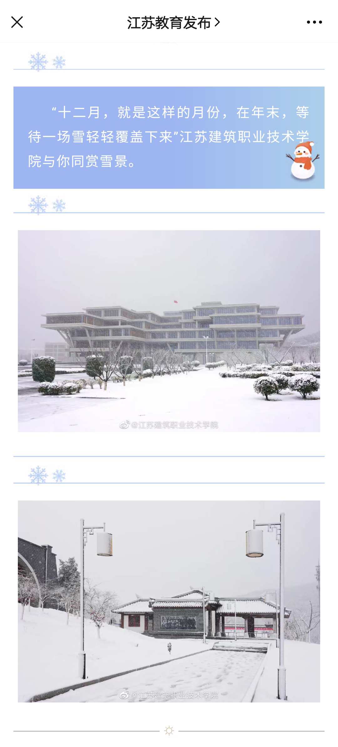 “十二月,就是这样的月份,在年末,等待一场雪轻轻覆盖下来”江苏建筑职业技术学院与你同赏雪景。