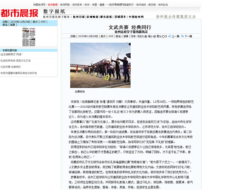 本报讯(徐报融媒记者 张瑾 通讯员 刘娜)文武兼修,术道并重。12月26日,一场别具特色的射艺比赛——2020徐州高校射艺联赛年度总决赛在江苏建筑职业技术学院射艺场开赛,所有参赛选手除了在箭场比拼射艺,还需书写一份《礼记·射义》作为参赛入场凭证,四强选手要会背诵《观德亭记》,作为进入半决赛的基本条件。