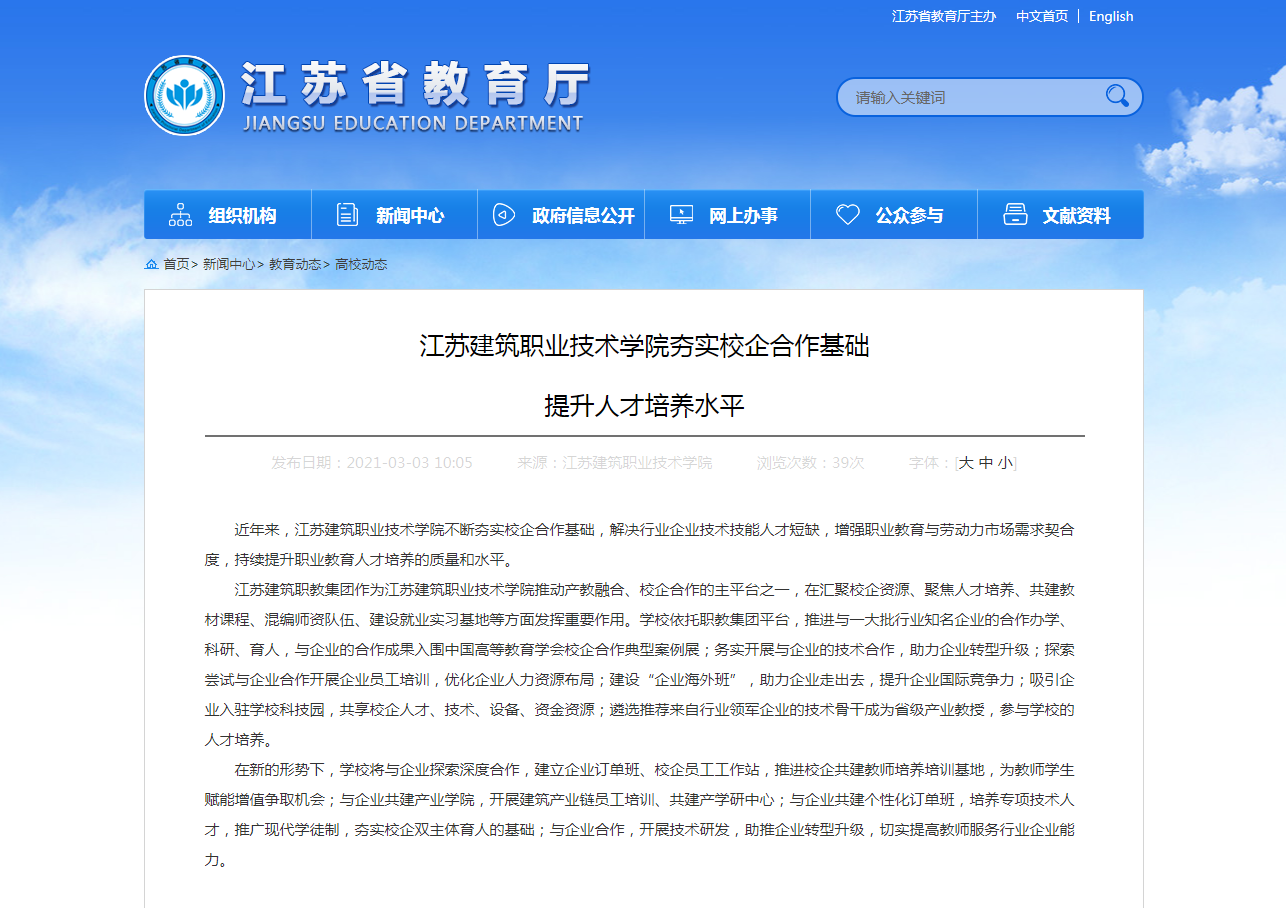 近年来,江苏建筑职业技术学院不断夯实校企合作基础,解决行业企业技术技能人才短缺,增强职业教育与劳动力市场需求契合度,持续提升职业教育人才培养的质量和水平。