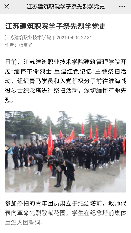 日前,江苏建筑职业技术学院建筑管理学院开展“缅怀革命烈士 重温红色记忆”主题祭扫活动,组织青马学员和入党积极分子前往淮海战役烈士纪念塔进行祭扫活动,深切缅怀革命先烈。
