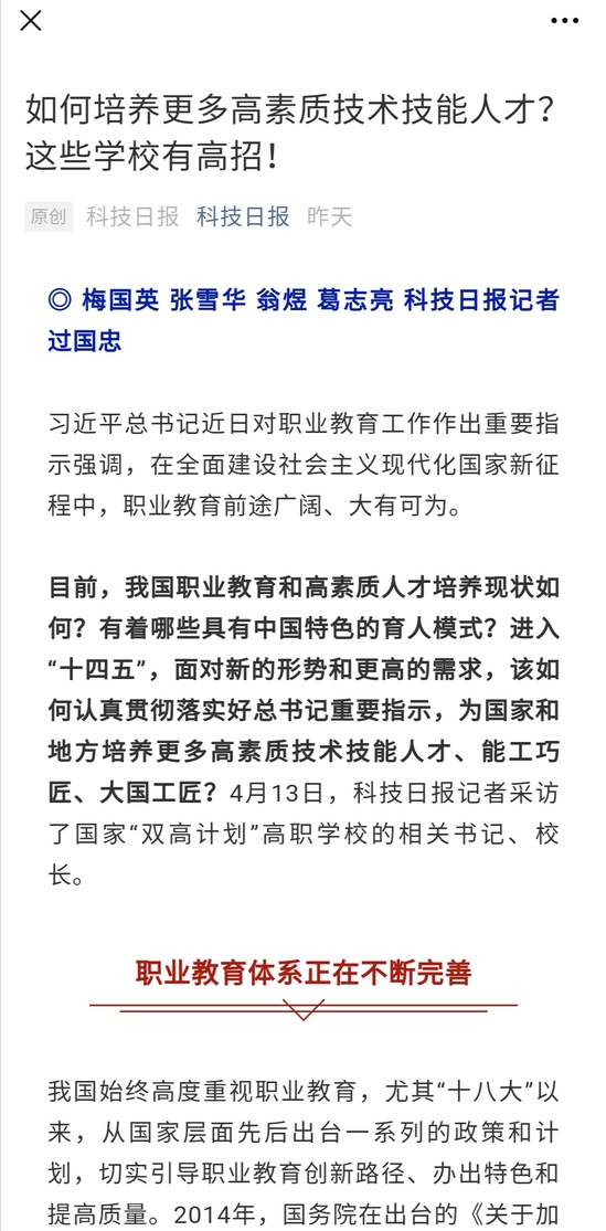 目前,我国职业教育和高素质人才培养现状如何?有着哪些具有中国特色的育人模式?进入“十四五”,面对新的形势和更高的需求,该如何认真贯彻落实好总书记重要指示,为国家和地方培养更多高素质技术技能人才、能工巧匠、大国工匠?4月13日,科技日报记者采访了国家“双高计划”高职学校的相关书记、校长。