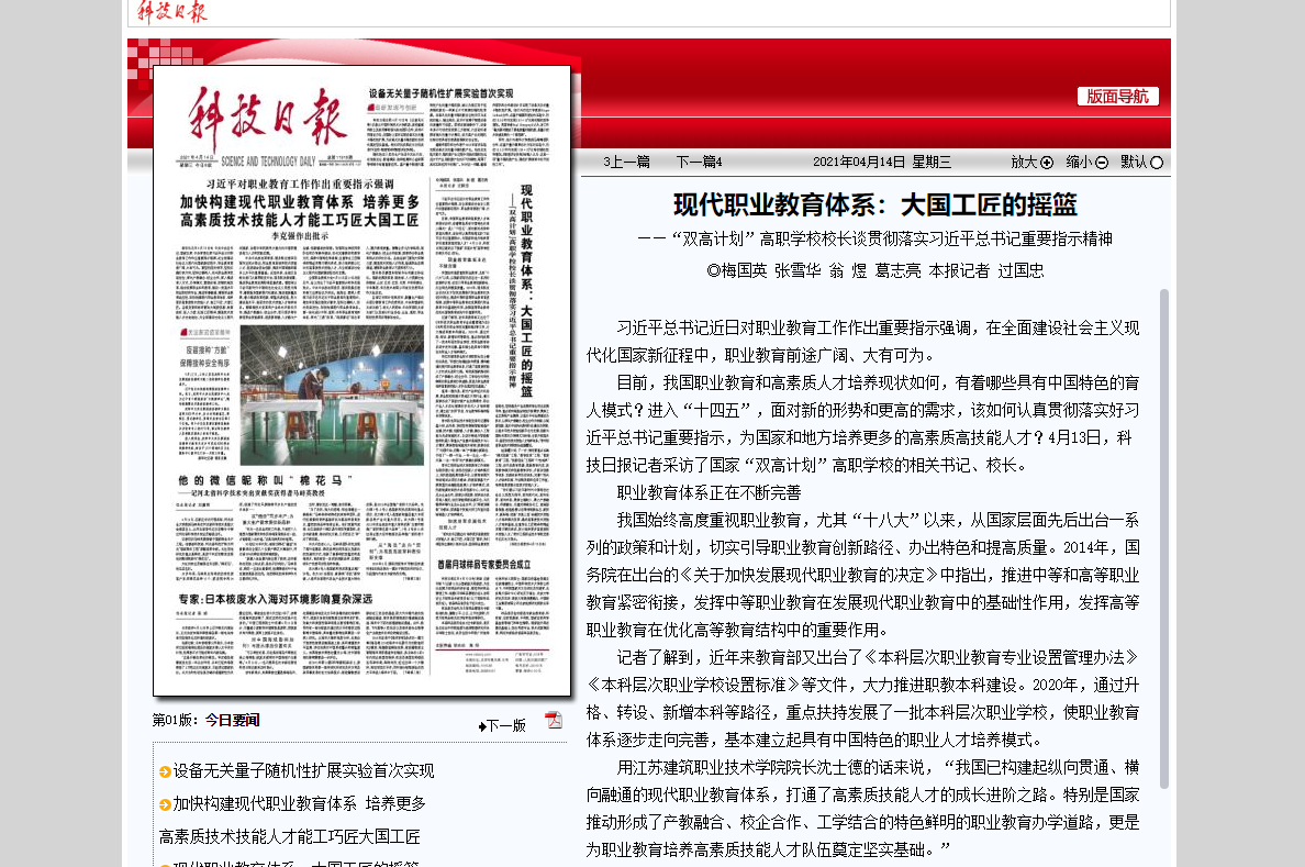 目前,我国职业教育和高素质人才培养现状如何,有着哪些具有中国特色的育人模式?进入“十四五”,面对新的形势和更高的需求,该如何认真贯彻落实好习近平总书记重要指示,为国家和地方培养更多的高素质高技能人才?4月13日,科技日报记者采访了国家“双高计划”高职学校的相关书记、校长。
