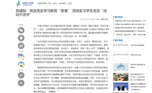 中国江苏网讯 为扎实推动党史学习教育,确保每一名党员“离校不离党、流动不流学”,近日,江苏建筑职业技术学院建筑装饰学院学生党支部将《中国共产党简史》等4本党史学习教育必读书籍以及《党支部党史学习教育计划》等,通过顺丰快递打包邮寄给30名外出顶岗实习的学生党员,为他们送去一份“学习套餐”。
