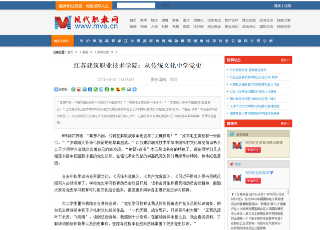 自党史学习教育开展以来,江苏建筑职业技术学院有力有序有效开展党史学习教育,不断挖掘传统文化中的党史,以传统文化为载体,全面落实学史明理、学史增信、学史崇德、学史力行的目标要求,除了认真抓好思政课堂主阵地以外,同步抓好抓实第二课堂的创新方式,用好红色资源和实践教材,用学生们喜闻乐见的方式根植理想信念。