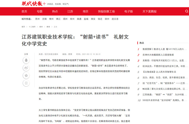 苏建院党委副书记梁惠说:“我们将党史学习教育与同学们感兴趣的礼射文化结合起来。比如礼射的读书会,不仅有传统经典,还有革命文化经典、社会主义先进文化经典。礼射是导向,学习是过程,育人是目的。用礼射引领学生开展党史学习教育,激发学生自主学习,切实做到学有特色、学出实效。”韩冰雪