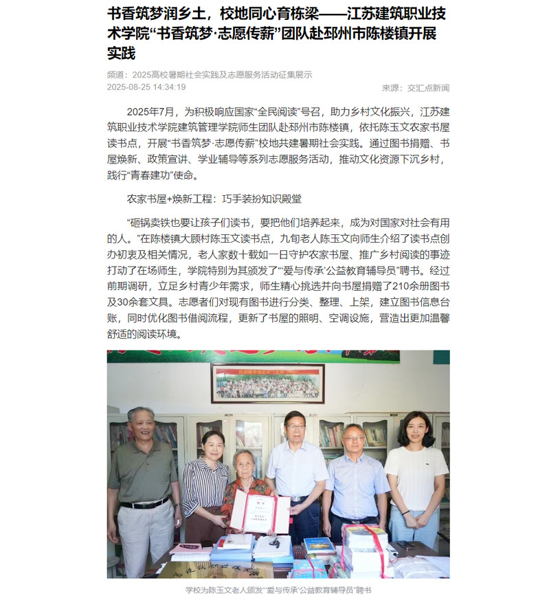 2025年7月,为积极响应国家“全民阅读”号召,助力乡村文化振兴,江苏建筑职业技术学院建筑管理学院师生团队赴邳州市陈楼镇,依托陈玉文农家书屋读书点,开展“书香筑梦·志愿传薪”校地共建暑期社会实践。通过图书捐赠、书屋焕新、政策宣讲、学业辅导等系列志愿服务活动,推动文化资源下沉乡村,践行“青春建功”使命。