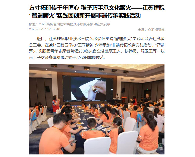 近日,江苏建筑职业技术学院艺术设计学院“智遗薪火”实践团联合江苏省总工会,在徐州园博园举办“工匠精神 少年承韵”非遗传拓教育实践活动。“智遗薪火”实践团青年志愿者带领200名来自全省建筑工人、快递员、环卫工等一线员工子女亲身体验这项始于汉代的非遗技艺。