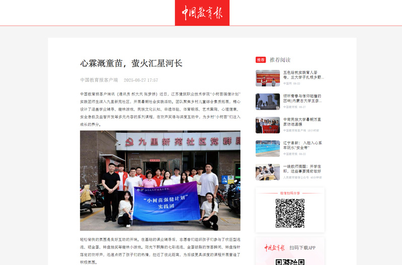 中国教育报客户端讯(通讯员 郝大天 张梦娇)近日,江苏建筑职业技术学院“小树苗强健计划”实践团师生深入九里新苑社区,开展暑期社会实践活动。团队聚焦乡村儿童综合素质拓展,精心设计了涵盖学业辅导、趣味游戏、民族文化认知、非遗体验、体育锻炼、艺术熏陶、心理健康、安全急救及益智开发等多元内容的系列课程,在欢声笑语与深度互动中,为乡村“小树苗”们注入成长的养分。