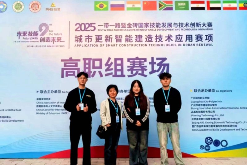 11月23日,由金砖国家工商理事会中方理事会、“一带一路”暨金砖国家技能发展国际联盟主办的2025“一带一路”暨金砖国家技能发展与技术创新大赛城市更新智能建造技术应用赛项总决赛在广州举行。由我校建筑建造学院学生拾硕成、王园园和陈春运组成的参赛团队(指导教师:毛燕红、安沁丽)在比赛中获高职组一等奖。
