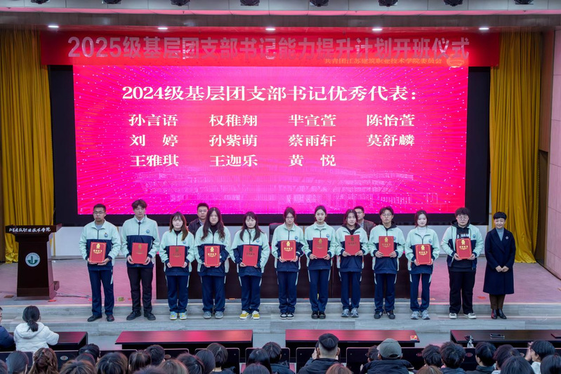 仪式中,梁惠为建筑管理学院建管24-3班孙言语等11名2024级基层团支部书记优秀代表颁发荣誉证书。建筑装饰学院建设24-1班蔡雨轩和智能制造学院机电24-1班封亚维分别代表2024级、2025级基层团支部书记进行发言。