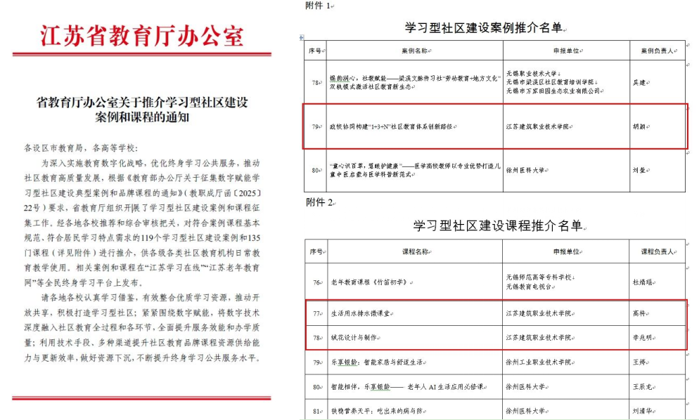 近日,江苏省教育厅发布《省教育厅办公室关于推介学习型社区建设案例和课程的通知》,我校申报的《政校协同构建“1+3+N”社区教育体系创新路径》案例和《生活用水排水微课堂》《绒花设计与制作》两门社区教育课程,分别获评省教育厅学习型社区建设推介案例和推介课程,并在“江苏学习在线”“江苏老年教育网”等全民终身学习平台发布。