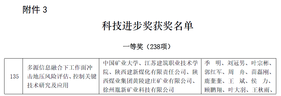 近日,2025年度中国商业联合会科学技术奖名单正式公布。由中国矿业大学牵头、我校作为第二完成单位(郭红军、苗磊刚、鹿奎奎老师参与)申报的“多源信息融合下工作面冲击地压风险评估、控制关键技术研究及应用”项目荣获科技进步奖一等奖。