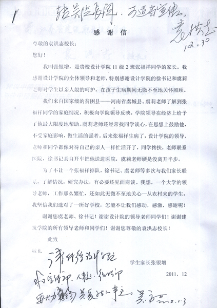 2011年12月30日,党委书记袁洪志收到了建筑设计学院一位学生家长的来信,信中充满了家长对设计学院领导和老师的感激之情。党委书记袁洪志、院长吴光林在信上批示,要求学校有关职能部门要大力宣传关爱学生的优秀事迹,大力弘扬厚生尚能的校训精神。