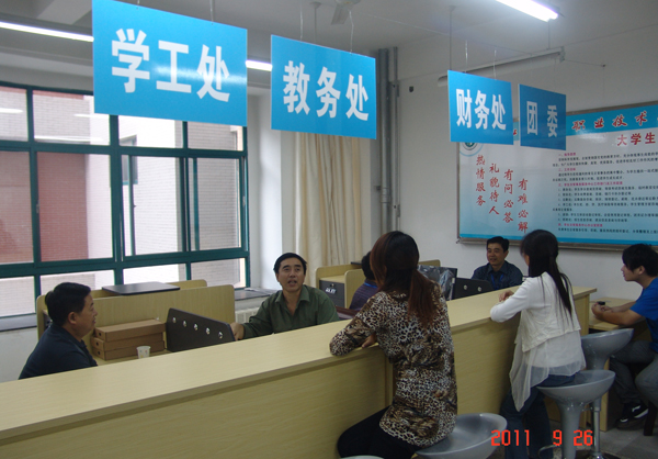 我校大学生日常事务服务中心采取集中办公的形式,每周周一、周四下午2:30—5:30,由教务处、财务处、后勤处、学工处、团委、招就处等六个职能部门安排专门教职工为学生办理日常事务,服务内容和服务时间公布于众。非集中办公时间也安排专门人员值班,负责学生日常服务引导、咨询,服务热线的接听登记、分类整理及上报处理、学生补卡等信息采集。