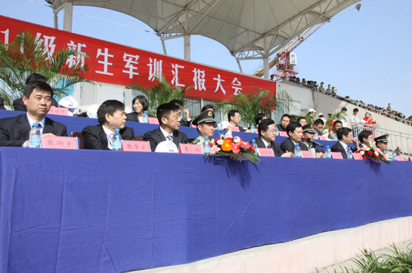 9月23日上午,我校在西校区体育场举行2011级新生军训汇报大会。校领导袁洪志、吴光林、季翔、任留钦、张登宏、沈士德,中国人民解放军73101部队教导员孙利舒在主席台就座并观看了军训汇报。