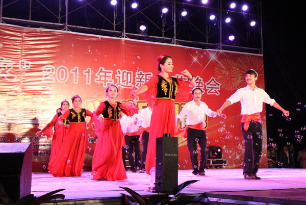 新疆籍少数民族学生身着民族特色的盛装,跳起了欢快的民族舞蹈。