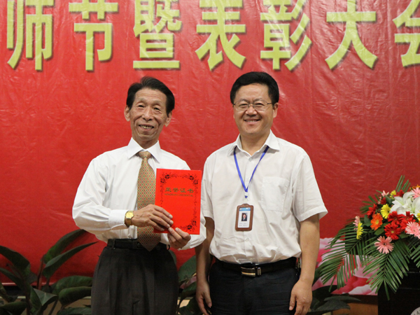 袁洪志为从事教育工作已满五十周年的教师颁奖