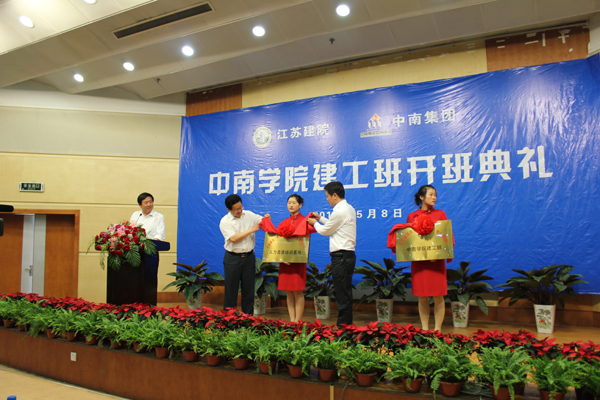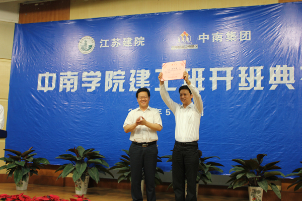 在欢快的音乐声中,袁洪志院长为袁水清副总经理颁发客座教授聘书,并共同为“中南学院—建工班”揭牌。