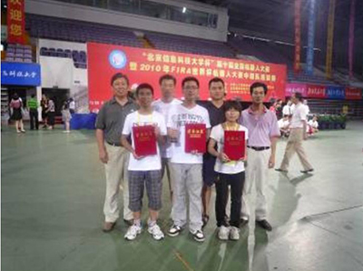 由机电学院戚海永、梁纯、王振士、鹿毅、李浩然等8名师生共同组成的拓远队代表我校参加了11VS11、5VS5半自主型足球机器人比赛。经过激烈角逐,拓远队战胜了上届亚军青岛科技大学等强队,荣获11VS11足球机器人一等奖,5VS5足球机器人二等奖。