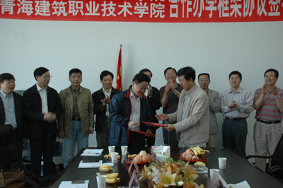 青海建筑职业技术学院是青海省五所高职院校之一,是由多所中专学校合并升格而成,具有良好的办学基础和鲜明的办学特色。这次双方就教师培养、学生教育管理、科研和精品课程建设、实训基地建设、信息交流等方面明确了各自的权利和义务,并在经费、运转机制等方面做出了原则性的规定。