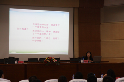 蒋其琴在报告中与大家分享了她的“与学生同行、与快乐同行、与成功同行、与春天同行”的工作理念。她从思想政治工作的原则和实务两个方面入手,结合自己的工作探索和实践,畅谈了辅导员的“责任”、“理想信念”教育、学生“自主管理”、“贫困生”工作、加强工作创新等七个方面的经验和体会。她强调辅导员应该积极发挥“五心”(公心、爱心、诚心、信心、恒心)——爱的力量,同时还应该重视研究和思考,在爱心中体现智慧,高效完成学生思想政治教育工作。