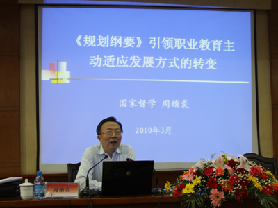 周稽裘在报告中着重阐述了三个方面的内容:一是职业教育正面临着30年来经济发展方式最大的历史性转折;二是规划职业教育未来发展的指导思想和战略目标;三是职业教育未来改革发展的主要任务。周稽裘的报告使与会人员深受启发和教育,对推动我校深化职业教育改革,促进学校“十二五”规划制定以及学校科学发展具有重要的指导作用。