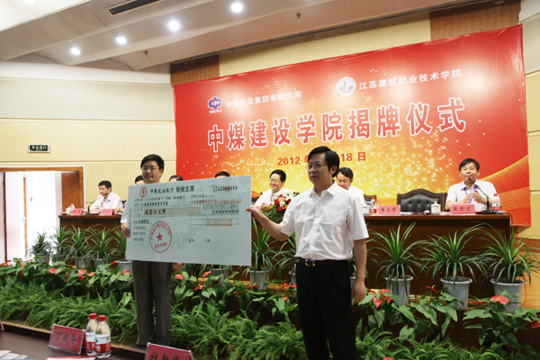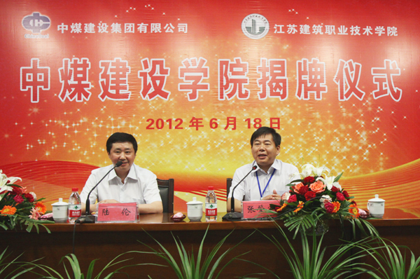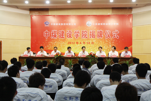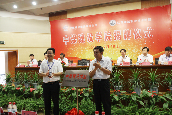 袁洪志对中煤能源集团领导亲临学校表示感谢,并介绍了学校概况。都基安与袁洪志共同为“中煤建设学院”揭牌。王锐锋宣读中煤建设学院干部任命文件,由中煤建设集团副总经理、总工程师陆伦任中煤建设学院院长,中煤建设集团人力资源部部长王延成任副院长,我校矿业学院院长张魁任副院长(常务)。随后,吴光林代表学校向“中煤建设学院”的揭牌、向新任中煤建设学院的院长、副院长表示祝贺。他说,江苏建院将充分尊重中煤建设集团的管理理念,进一步挖掘学校和企业的优势资源,共同制定人才培养方案,共同研定教学计划,共同开发专业课程,共同组织实施教学,通过人员互动、理论和实践结合以及资源共享,使学生在掌握必备的专业知识和素质之外,还能够学习或接触到企业最新的专业技术,感悟先进的企业文化,提升自身职业素养和社会责任感、缩短岗位适应期,把中煤建设学院的学子们培养成为具有现代企业创新素质的社会满意、行业欢迎、企业需要的人才。