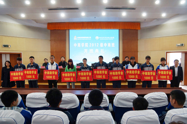 开班仪式上,学校、企业领导共同为2012级中南班的学生颁发中南助学金,共有10名品学兼优的学生获得此项助学金。2010级中南班学生代表、2012级中南班学生代表分别作了热情洋溢的发言。