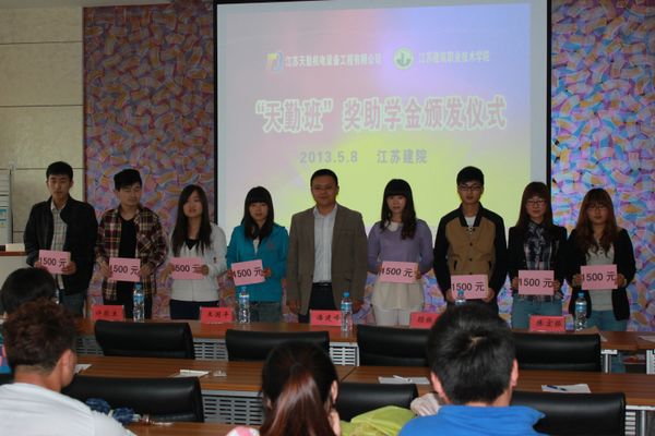5月8日,首届“天勤班”第一次企业奖助学金颁发仪式在建筑技术馆会议室隆重举行,江苏天勤机电设备工程有限公司市场总监潘建峰、市场助理顾振梅,设备学院党领导、相关老师以及天勤班57名学生出席会议。