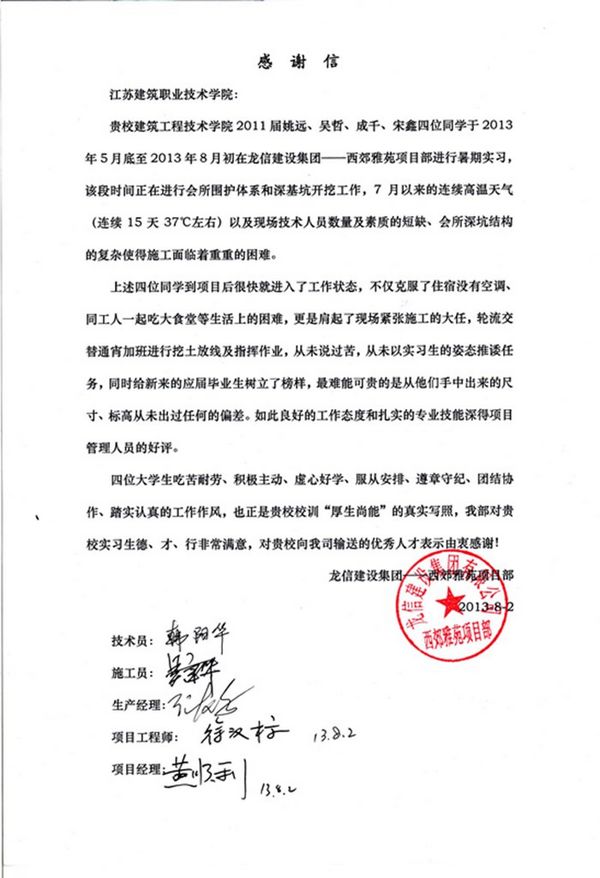 近日,建工学院收到来自龙信建设集团西郊雅苑项目部的感谢信,信中表扬了我校建工班11级的姚远、吴哲、成千、宋鑫等同学在实习期间的突出表现,并对学校注重培养学生吃苦耐劳、团结拼搏、无私奉献的良好职业素质,注重培养学生解决问题、自我提高与自我管理等技能,为企业输送优秀学生表示衷心地感谢,现将《感谢信》全文转发如下: