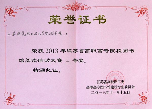 近日,从江苏省高等学校图书情报工作委员高职高专图书馆建设专业委员会第十三次年会传来消息,我校图书馆在2013年江苏省高职高专院校图书馆阅读活动大赛中喜获二等奖。 本次大赛的参赛对象为全省高职高专图书馆,以参赛报名、材料提交、网络互评和专家评审等方式进行,该项赛事是高职院校图书馆界的一项盛事,不仅反映出各馆的综合实力和服务水平,也使图书馆自身在管理、资源和环境建设、馆员精神面貌等软、硬件建设方面迈上了新台阶。