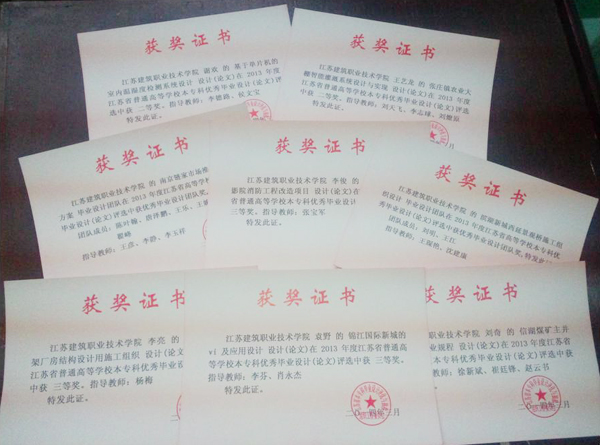近日,根据省教育厅文件《关于公布2013年江苏省普通高等学校本专科毕业设计(论文)评优与抽检结果的通知》(苏教高〔2014〕4号),我校推荐的《基于单片机的室内温湿度检测系统设计》、《张庄镇农业大棚智能灌溉系统设计与实现》荣获优秀个人毕业设计二等奖,《锦江国际新城的VI及应用设计》、《某轻钢门式刚架厂房结构设计及施工组织》、《信湖煤矿主井基岩段施工作业规程》、《徐州市银座电影院消防工程改造项目》荣获优秀个人毕业设计三等奖;《滨湖新城西延景观桥施工组织设计》、《南京链家市场推广活动策划方案》荣获优秀团队毕业设计优秀奖。
