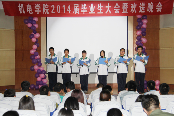 5月23日晚,机电工程学院在学术报告厅举行2014届毕业生大会暨欢送晚会。南京鹏力集团运营总监祝金国,龙湖物业杭州分公司总经理吕仁华分别从南京、杭州来到晚会现场与机电学院领导、老师与341名毕业生一同观看晚会,联欢话别。
