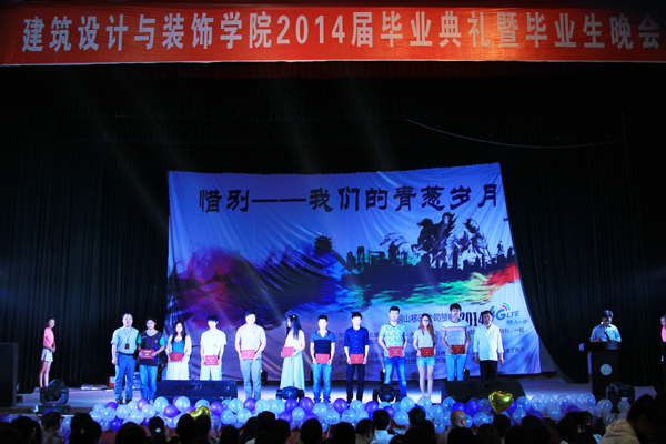 毕业典礼上,设计学院领导、班级辅导员一起为2014届毕业生颁发毕业证书,该院的深度合作企业——江苏紫浪装饰公司严俊总经理专程赶到典礼现场,为紫浪班的优秀毕业生颁发毕业证书,典礼上播放的《惜别.三年》毕业视频回顾2014届毕业生在校学习、生活的点点滴滴,表达了毕业生对老师的感恩与不舍,眷恋与离别氛围深深感染现场观众。此外,毕业生在“惜别——我们的青葱岁月”毕业生晚会节目表演中感恩学校、讲述不舍深情。