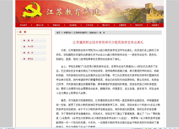 据悉,作为国家示范高职院校,江苏建筑职业技术学院一直坚持面向全国招生,并根据国家统一安排,接受了多批少数民族地区学生的教育教学工作。目前,该校共有23个民族370多名少数民族学生在校就读。由于不少少数民族学生路途遥远,有的家庭比较困难,有的还存在语言障碍,为了帮助所有学生健康成长、尽快成才,该校还专门建立了管理制度,建立了“3+1”帮扶制度(1名教师、2名学生分别帮助1名少数民族指导学业和个人生活),使得每一名少数民族学生都能得到一对一个性化的关爱。今年初,一名维吾尔族的学生古丽以拾金不昧的实际行动感动了建院学子,其行为得到了社会广泛赞誉。