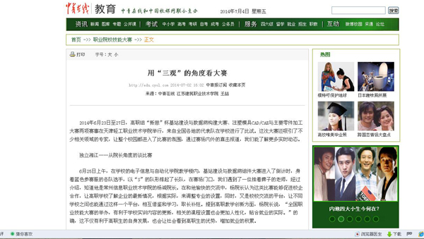 7月4日,中青在线刊登我校学生王喆文章《用“三观”的角度看大赛》,全文见http://edu.cyol.com/content/2014-07/02/content_10306689.htm。