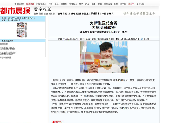 晨报讯(记者 张敏玲 摄影报道) 江苏建筑职业技术学院6日迎来4541名大一新生,学院贴心地为新生准备了中秋礼物——代金券,为家长在羽毛球馆铺好了被褥。