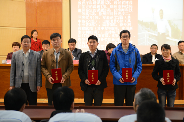 会上还对荣获第四届科技工作大会先进集体奖、先进个人奖、优秀科技成果奖、优秀发明专利奖、优秀科技论文奖的集体和个人予以了表彰。矿业与交通工程学院副院长徐新斌、建筑工程学院教师王军强分别代表先进集体、先进个人发言。