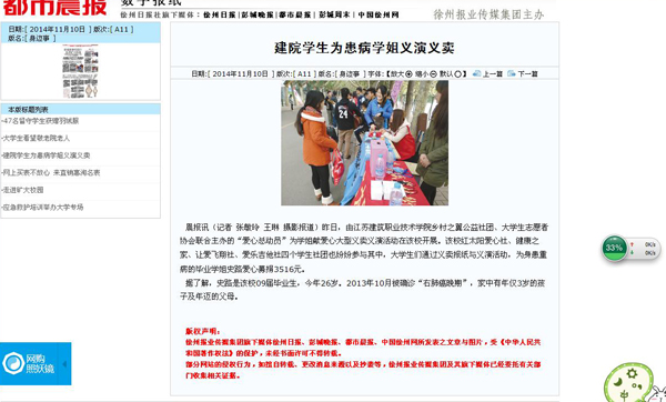 晨报讯(记者 张敏玲 王琳 摄影报道)昨日,由江苏建筑职业技术学院乡村之翼公益社团、大学生志愿者协会联合主办的“爱心总动员”为学姐献爱心大型义卖义演活动在该校开展。该校红太阳爱心社、健康之家、让爱飞翔社、爱乐吉他社四个学生社团也纷纷参与其中,大学生们通过义卖报纸与义演活动,为身患重病的毕业学姐史路爱心募捐3516元。