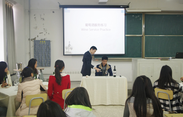 赵萌采用“全景式教学”方法,讲授了“葡萄酒服务”。课程采取实景化教学、分解式演练、真实服务、互动讲解,全体学生参与的“全景式教学”方法。课堂气氛活泼,学生完全被教师调动,每位同学不断互换角色,边学边练,在比较短的时间里,基本掌握葡萄酒的规范服务。