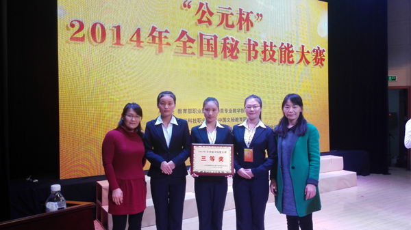 2014年全国秘书技能大赛于11月28日至30日在台州科技职业学院成功举办。经过两天的激烈角逐,我校代表队最终荣获团体三等奖,文秘12-1班丁亚君、文秘13-2班王灼镕荣获个人全能二等奖,文秘12-1班晁雅茹荣获个人全能三等奖。另外,三位选手还获得多项个人单项奖:王灼镕获一等奖1项、二等奖1项,丁亚君获二等奖2项,晁雅茹获二等奖1项、三等奖1项。