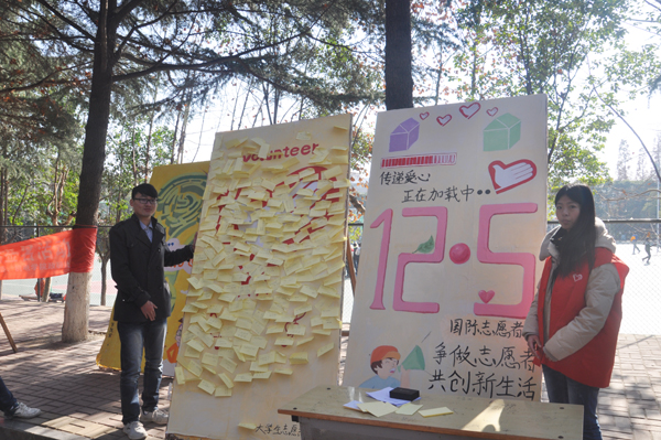 12月5日是国际志愿者日,为了进一步倡导志愿精神,增强和扩大志愿服务精神的影响力及认同感,培育志愿服务理念,以实际行动迎接志愿者自己的节日,我校大学生志愿者协会组织学生志愿者在校内外举行了一系列的志愿活动,弘扬“奉献、友爱、互助、进步”的志愿精神。