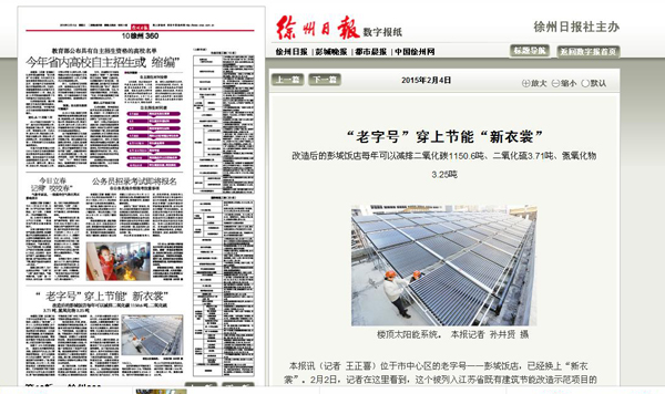 2月4日的《徐州日报》以《“老字号”穿上节能“新衣裳”》为题报道了我校江苏省建筑节能中心技术支持徐州老字号——彭城饭店改造工程,该项目被列入江苏省既有建筑节能改造示范项目。