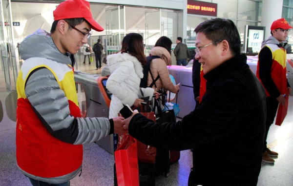 在团市委举办的“2015年春运志愿服务工作启动仪式”上,我校志愿者们纷纷表示要弘扬助人为乐、无私奉献的传统美德,展现新时期青年健康向上、热情洋溢的青春风采,脚踏实地,积极主动地做好志愿服务工作。经过严格规范的培训,我校志愿者被分配在火车站广场、售票大厅、安检口、电梯口、候车室等场地,为旅客购票、取票提供咨询服务,为老弱病残孕、行动不便的旅客提供帮助,引导旅客有序进出站。志愿者们面对高强度的工作,积极主动,毫无怨言,以灿烂的微笑温暖着每一位旅客的回家之路,为徐州春运增添了一道靓丽的风景,展示了我校学子良好的精神面貌。我校大学生志愿者们的优异表现得到了广大乘客及上级团组织和服务单位的高度赞扬。同时,志愿服务工作也受到各界的高度关注,团中央、中新网、团省委、江苏卫视、徐州广电、徐州日报、团市委等多家单位、媒体先后报道数十次。