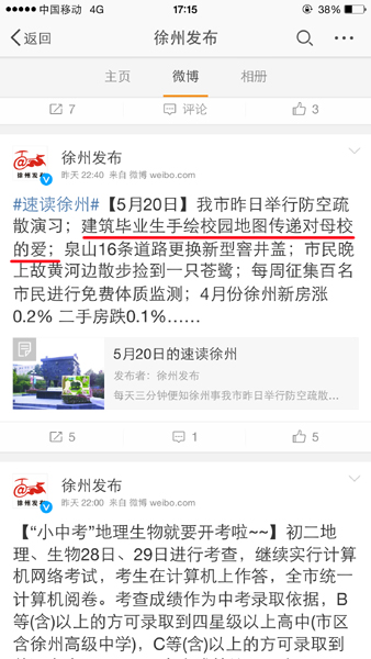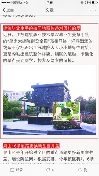 近日,我校官方微信发布的文章《我校毕业生手绘建院地图传递对母校不变的爱》,受到网友纷纷点赞,产生良好社会影响,文章先后被《都市晨报》、徐州政务微博“徐州发布”转载、引用,江苏教育厅官方微博“江苏教育”也将于近期报道。(搜索微信公众号jsjzi0516,或扫下面二维码,关注江苏建筑职业技术学院官方微信)