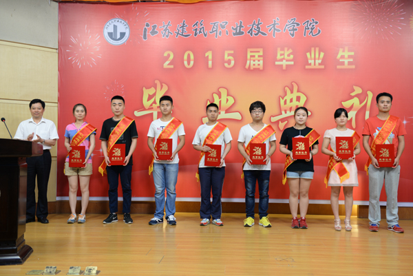 党委副书记张登宏宣读学校《关于授予李旭等143名同学“2015届优秀毕业生”称号的决定》。党委书记吴光林向优秀毕业生代表颁发优秀毕业生荣誉证书,院长孙进向毕业生代表颁发毕业证书。