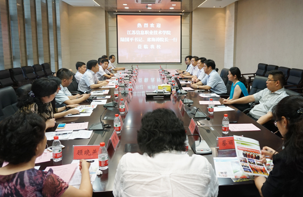 6月23日,江苏信息职业技术学院党委书记陆国平,院长、党委副书记席海涛率队来我校进行工作交流。校党委书记吴光林,院长、党委副书记孙进,副院长任留钦热情接待了来访宾客。座谈交流在图书馆会议室进行。