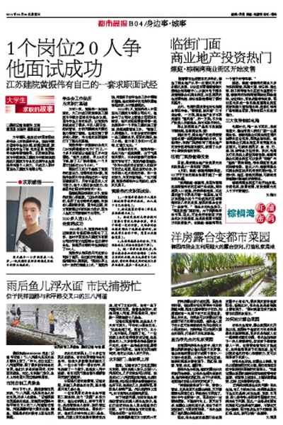 近日,我校传媒学院学生毕业设计作品、建工学院学生求职故事受到《都市晨报》关注,6月26日,该报在A12版、B04版分别以《徐州“八大样”穿新衣——江苏建院毕业生为徐州土特产设计外包装》、《一个岗位20人争 他面试成功——江苏建院黄振伟有自己的一套求职面试经》为题予以刊登。