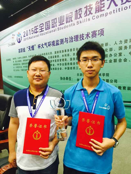 7月3日下午, 2015年全国高职院校职业技能大赛最后一项赛事——大气环境监测与治理技术比赛结束,我校代表队以总分第一的成绩荣获金奖。7月4日上午,大赛闭幕式在天津海河教育园区体育馆举行,教育部长袁贵仁亲自主持闭幕式,中央政治局委员、国务院副总理刘延东出席会议并做重要讲话。大气环境监测与治理技术赛项执委会副主任、我校院长孙进教授和学校有关部门、设备学院负责人、指导教师、获奖学生一同参加了闭幕式。